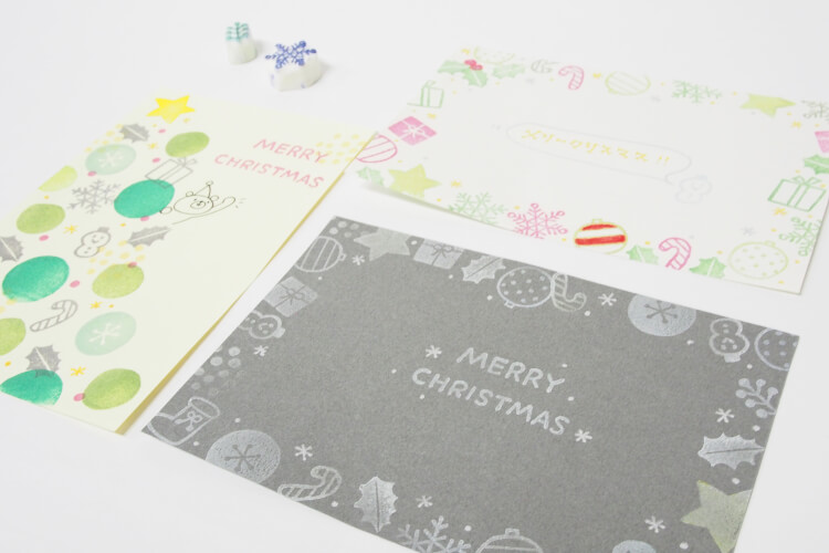 ④はんこやインク、折り紙等を組み合わせて、年賀状やクリスマスカードに仕上げます。