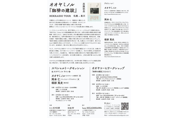 京都のオオヤコーヒ主宰、コーヒー焙煎家オオヤミノルさんの新刊『珈琲の建設』出版記念イベントを、札幌と東川、3か所の会場で開催いたします。