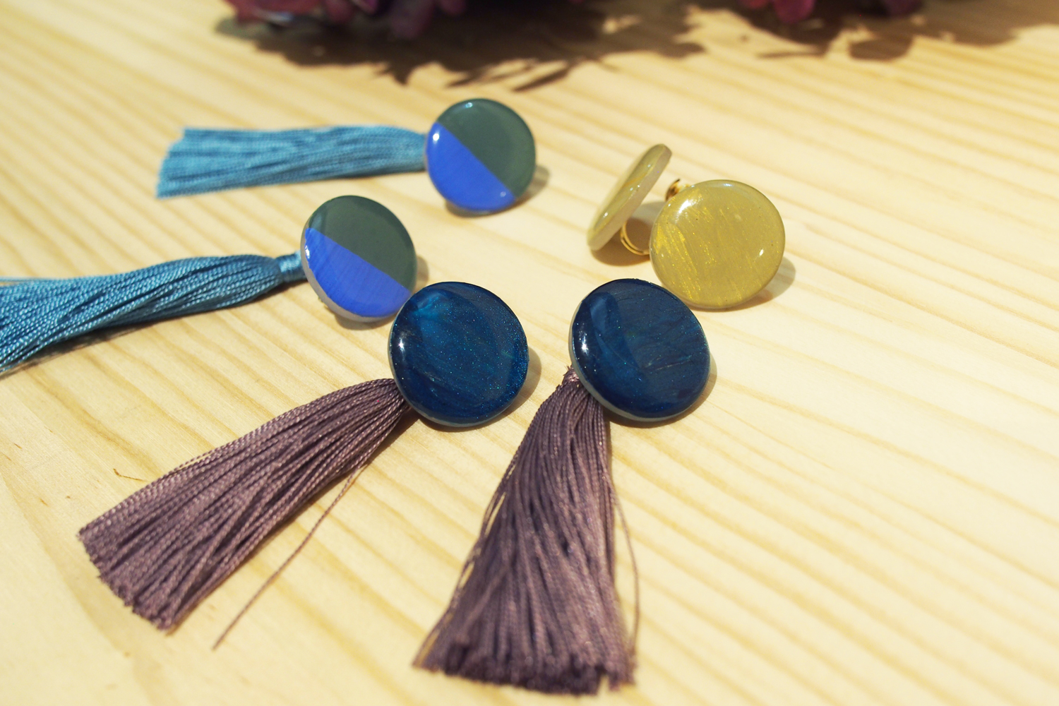 丸い形のプラバンにアクリル絵の具を使って色を塗り、レジンをのせて、ピアスかイヤリングに仕上げます。