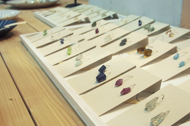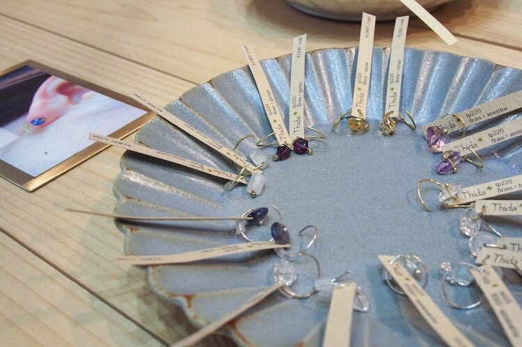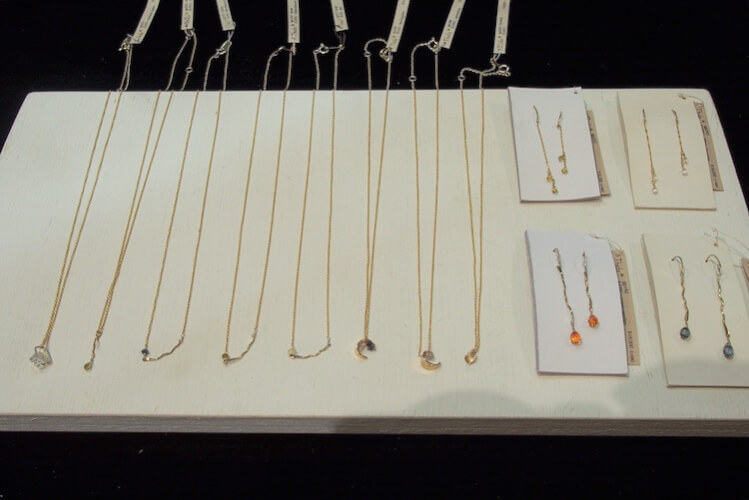 普段展示していない種類のアクセサリーや新作が並ぶ他、リングのサイズオーダーも承ります。